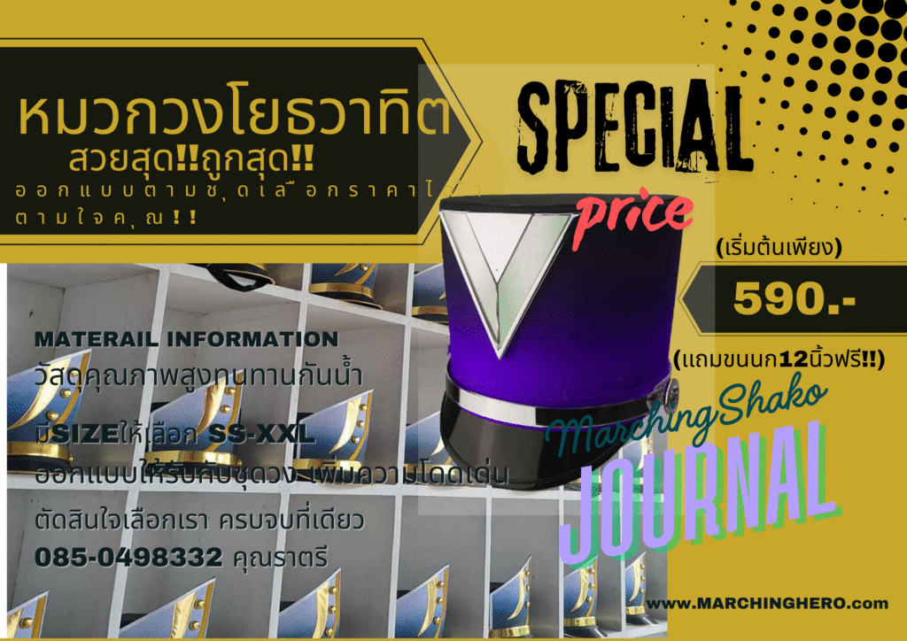 หมวกทั้งhelmetและshako เราผลิตเอง หมดปัญหาสั่งชุดหาหมวกไม่ได้หรือสีหมวกไม่เข้ากับชุดและเรายังบริการสั่งผลิตป้ายธงขบวน รองเท้าวงโยธวาทิตอีกด้วย ครบ จบที่เดียวไม่ต้องเบิกจ่ายหลายรอบ